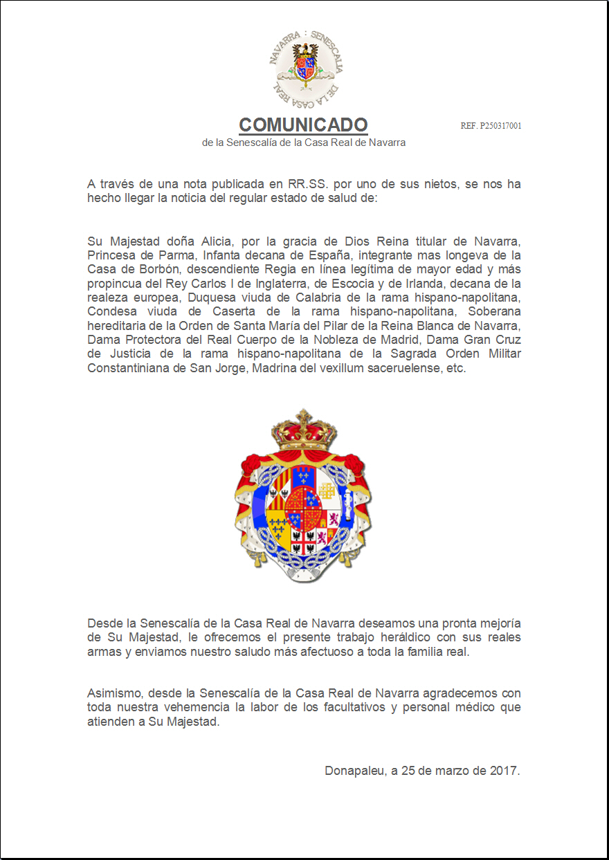 S.M. doña Alicia I fue la LII depositaria de los derechos dinásticos del Reino de Navarra y por mandato imprescriptible de sangre descendiente directa de sus reyes Enneco "Arista" [i], García Ennecones [ii], Fortún Garcés [iii], García Sánchez [v], Sancho "Abarca" [vi], García "el Tembloroso" [vii], Sancho "el Mayor" [viii], García "el de Nájera" [ix], García "el Restaurador" [xiv], Sancho "el Sabio" [xv], Teobaldo "el Trovador" [xvii], Enrique "el Gordo" [xix], Juana "de Champaña" [xx], Luis "el Hutín" [xxi], Juana "de Navarra" [xxv], Carlos "el Justiciero" [xxvi], Carlos "el Noble" [xxvii], Blanca "de Navarra" [xxviii] y Juan "el Usurpador" [xxix], Leonor "de Navarra" [xxx], Catalina "de Foix" [xxxii], Enrique "el Sangüesino" [xxxiii], Juana "de Albret" [xxxiv], Enrique "el Bearnés" [xxxv], Luis "el Justo" [xxxvi], Luis "el Grande" [xxxvii], Luis "el Bienamado" [xxxviii], Carlos "de Artois" [xliii], Roberto "de Parma" [xlv] y Elías "de Parma" [xlviii]. MATRIMONIO Y DESCENDENCIA:
