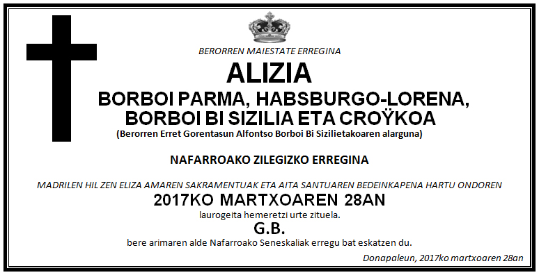 NOMBRE COMPLETOAlicia Maria Teresa Francesca Luisa Pia Anna Valeria de Borbón-Parma, Habsburgo-Lorena, Borbón-Dos Sicilias, y Croÿ. Sobrenombres: "la Longeva" 52.114, "la Infanta" 52.42, "de Navarra" 52.12, "de Parma" 50.22 Titulación extranjera: infanta de España, duquesa de Calabria, condesa de Caserta, princesa de Parma INFORMACIÓN PERSONAL