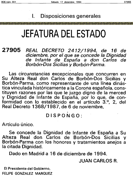 Borbón Parma. El hecho de no instar simplemente la nacionalidad española sino