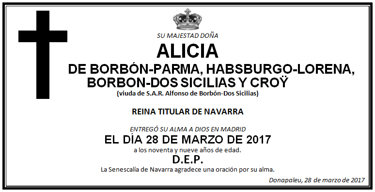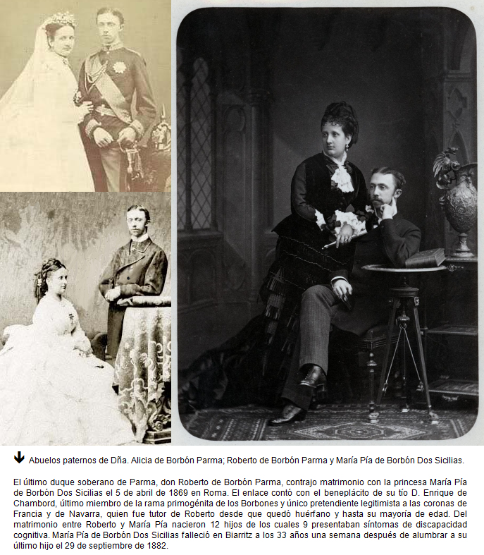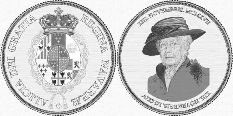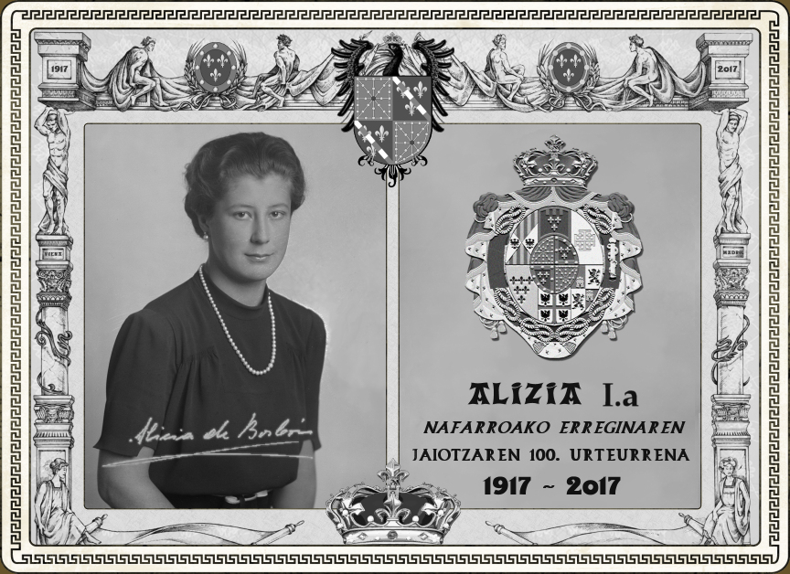S.M. doña Alicia I fue la LII depositaria de los derechos dinásticos del Reino de Navarra y por mandato imprescriptible de sangre descendiente directa de sus reyes Enneco "Arista" [i], García Ennecones [ii], Fortún Garcés [iii], García Sánchez [v], Sancho "Abarca" [vi], García "el Tembloroso" [vii], Sancho "el Mayor" [viii], García "el de Nájera" [ix], García "el Restaurador" [xiv], Sancho "el Sabio" [xv], Teobaldo "el Trovador" [xvii], Enrique "el Gordo" [xix], Juana "de Champaña" [xx], Luis "el Hutín" [xxi], Juana "de Navarra" [xxv], Carlos "el Justiciero" [xxvi], Carlos "el Noble" [xxvii], Blanca "de Navarra" [xxviii] y Juan "el Usurpador" [xxix], Leonor "de Navarra" [xxx], Catalina "de Foix" [xxxii], Enrique "el Sangüesino" [xxxiii], Juana "de Albret" [xxxiv], Enrique "el Bearnés" [xxxv], Luis "el Justo" [xxxvi], Luis "el Grande" [xxxvii], Luis "el Bienamado" [xxxviii], Carlos "de Artois" [xliii], Roberto "de Parma" [xlv] y Elías "de Parma" [xlviii]. MATRIMONIO Y DESCENDENCIA: