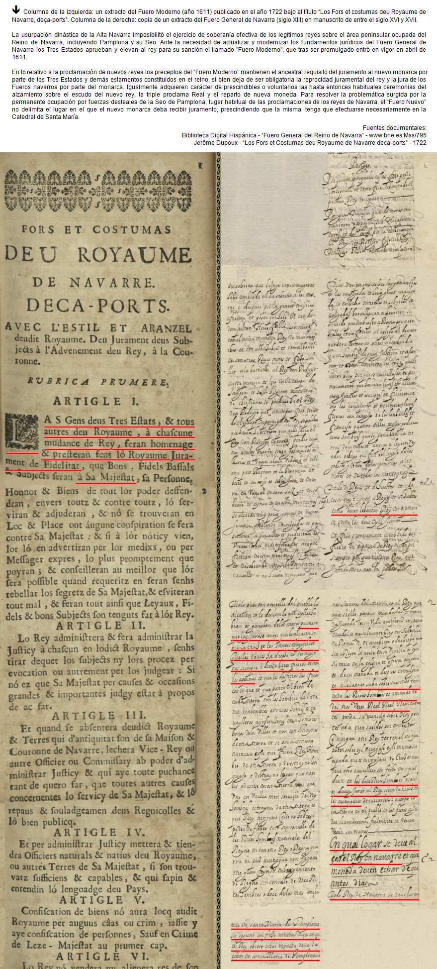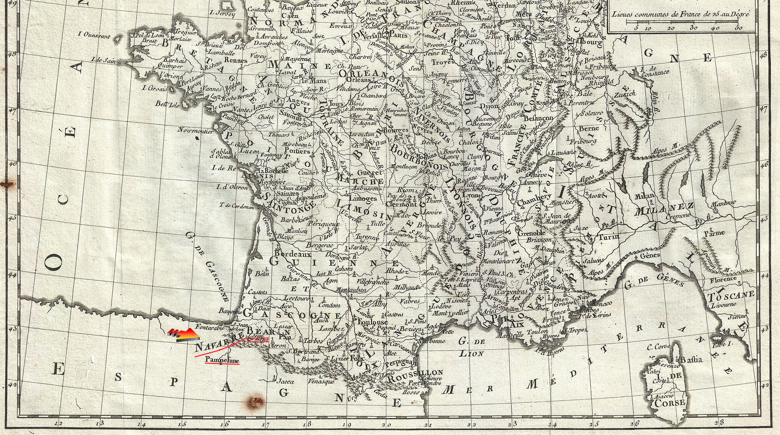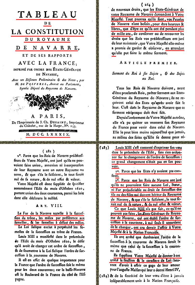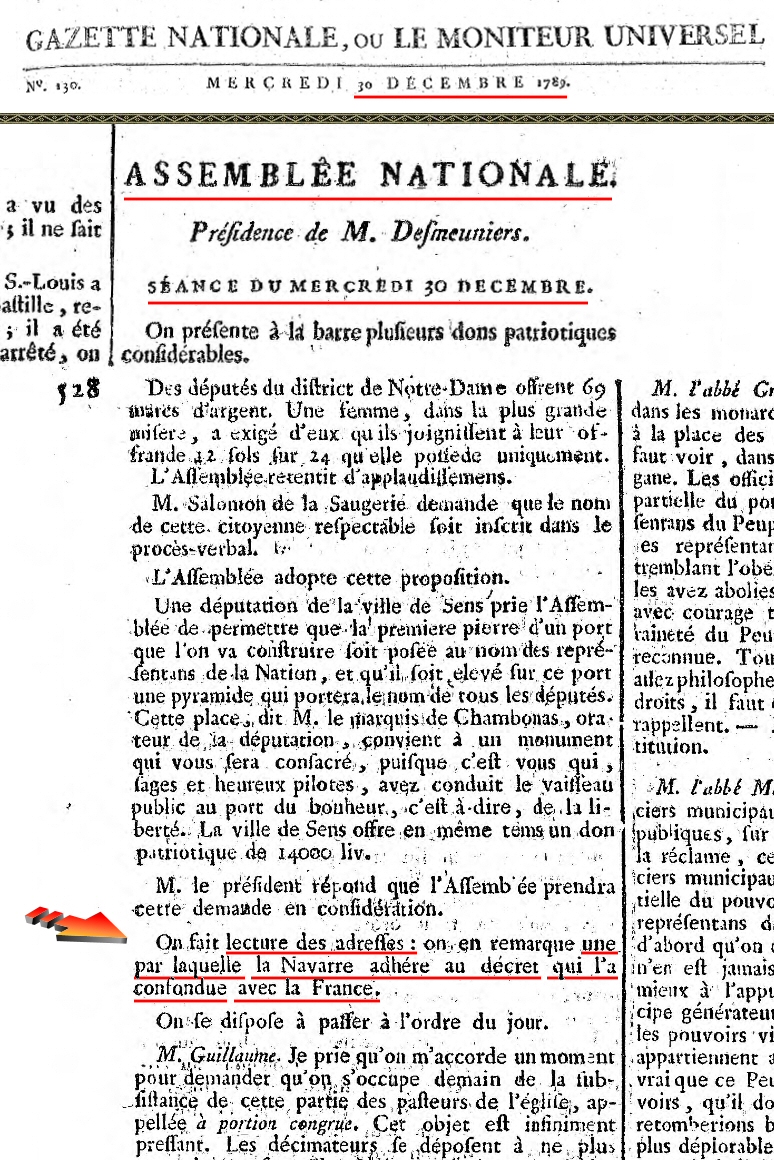 "(...) El 18 de febrero del año 1789 52.210 S.M. el rey Luis XVI de Francia y V de Navarra remitió una orden al senescal del Reino de Navarra a fin de que una delegación de diputados navarros acudiesen a la convocatoria de los Estados Generales de Francia, que llevaban sin celebrarse desde el año 1615, y que con carácter extraordinario el rey tenía previsto constituir en Versalles para tratar de encontrar soluciones a la grave crisis financiera que por aquel entonces padecía Francia. frente a la convocatoria de los Estados Generales de Francia Sin embargo, y tal y como sucedió en la anterior convocatoria de 1649, los Estados Generales de Navarra convocados por el comisario del rey en Navarra, Philippe-Mathieu-Marie marqués de Lons52.210, se encontraban reunidos46.52 desde el 16 de marzo de 1789 en Donibane Garazi (San Juan Pie de Puerto)48.6 y habían decidido, recelosos de su soberanía, rehusar cumplir la orden de su monarca por considerar irregular, ilegal y anticonstitucional39.2 el procedimiento de citación a los Estados Generales de Francia alegando que Navarra era un reino distinto y separado39.2 del vecino Reino de Francia. En la misma protesta o remontrance del 4 de abril52.210 solicitaron al monarca que las posteriores notificaciones dirigidas al pequeño reino navarro fuesen remitidas directamente a los Estados Generales de Navarra, y no al senescal del reino, siendo la primera la principal institución soberana de Navarra compuesta por los tres estamentos del reino: clero, nobleza y los representantes del pueblo llano. Atendiendo a la petición de los navarros S.M. el rey don Luis revocó la carta de convocatoria enviada al Senescal de Navarra y envió una "invitación" a los Estados Generales de Navarra para que acudiesen a Versalles diputados de la misma en condición de "invitados", reconociendo la independencia de los Estados Generales del reino de Navarra frente a los del reino de Francia. Pese al cumplimiento de las formalidades por parte del rey, los navarros decidieron no enviar ninguna delegación, ni siquiera a título informativo. Siguiendo por lo tanto el protocolo organizativo habitual, la segunda convocatoria del año de los Estados Generales de Navarra comenzaron sus sesiones el 15 de junio48.6. Si bien el lugar de reunión solía ser rotatorio entre las villas más significativas del pequeño reino, al igual que lo ocurrido en la primera convocatoria precedente de marzo, la villa elegida por los bajonavarros como sede para la segunda convocatoria de junio volvió a ser Donibane Garazi debido a su tranquilidad y alejamiento geográfico52.246 con respecto a las capitales de Donapaleu en Navarra y Pau en el Bearne, que habían soportado algunas protestas generadas por los estamentos privilegiados, sobre todo por la "nobleza de toga", el año anterior de 1788. Mientras tanto en París acababa de acontecer un luctuoso suceso. Coincidiendo con la celebración de los Estados Generales del Reino de Francia, la delicada salud del delfín Luis José, inmediato heredero de su padre Luis XVI en los reinos de Francia y de Navarra, empeoró gravemente. Luis XVI y su mujer la reina María Antonieta abandonaron precipitadamente Versalles rumbo al castillo de Meudon en el que agonizaba el delfín. Los siguientes días resultaron un calvario para los monarcas. El anhelado delfín, al que casi tardaron 10 años en engendrar, moría finalmente el 4 de junio sin haber podido celebrar su octavo cumpleaños. El estricto protocolo palatino, que la reina María Antonieta tanto odiaba, le impidió participar en las exequias de su hijo. Los derechos dinásticos del desdichado delfín recayeron en su único hermano varón, Luis Carlos, de apenas 4 años de edad. Los soberanos, completamente abatidos, regresaron a Versalles donde fue organizado un sencillo funeral por la eterna alma del difunto niño. Desconsolados, el 14 de junio María Antonieta y el rey se retiraron una semana al palacio de Marly para pasar el duelo. Pero sin solución de continuidad y durante la luctuosa ausencia del monarca, los acontecimientos se fueron precipitando. El 17 de junio de 1789 los diputados del tercer estado promotores de la díscola y paralela asamblea alternativa a la del rey adoptaron el nombre de "Asamblea Nacional" para la suya. Los asambleístas, además de querer romper el orden de representación estamental franco, trataron de acceder para celebrar sus reuniones a la misma sala en la que se oficiaban los Estados Generales de Francia, provocando que el monarca tuviera que dictar una orden directa prohibiéndoles la entrada. Ante la prohibición y lejos de amilanarse, los asambleístas redoblaron el pulso rupturista y optaron por reunir su recién nombrada Asamblea Nacional de forma alternativa en la cercana "Sala del Juego de Pelota", también en Versalles y a escasa distancia de la sala de los Estados Generales de Francia. Los 577 diputados del tercer estado que allí se reunieron adoptaron el compromiso de no disolverse hasta dotar a Francia de una Constitución. Por encima de las tensiones y las dos posiciones enfrentadas que trataban de imponerse en la política gala, ya fueran las tradicionales de mentalidad conservadora o las nuevas ideas liberales revolucionarias que comenzaban a canalizarse, el objetivo del rey era la de tener un reinado próspero, lo que a su vez le implicaba en la tarea de posibilitar la cohesión civil y facilitar a toda costa una acuciante reforma fiscal que sacara a Francia de su actual difícil situación económica, agravada por la crisis financiera, falta de alimentos y un sistema impositivo principalmente sostenido por el Tercer Estado. Pudiendo utilizar la fuerza militar para reafirmar los privilegios de los estamentos del Antiguo Régimen frente a los desplantes y pretensiones de los revolucionarios, el monarca prefirió posicionarse por encima de las posturas enfrentadas y ejercer un papel de mediador y garante institucional. Oponiéndose al derramam