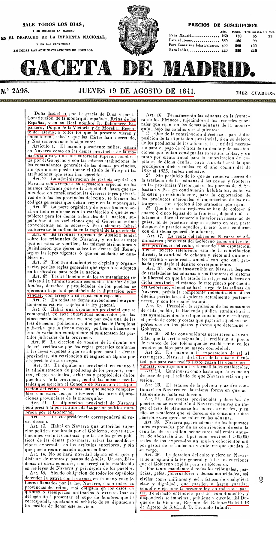confirmación y modificación de los fueros de Navarra decretadas por las Cortes”