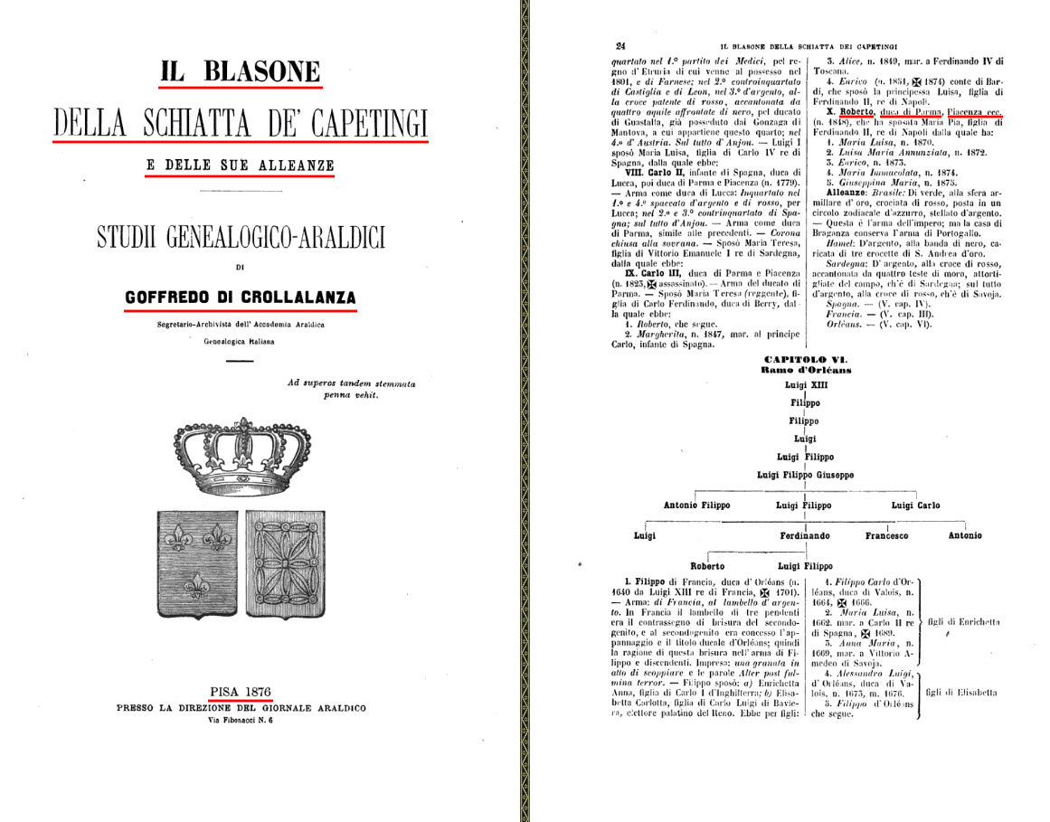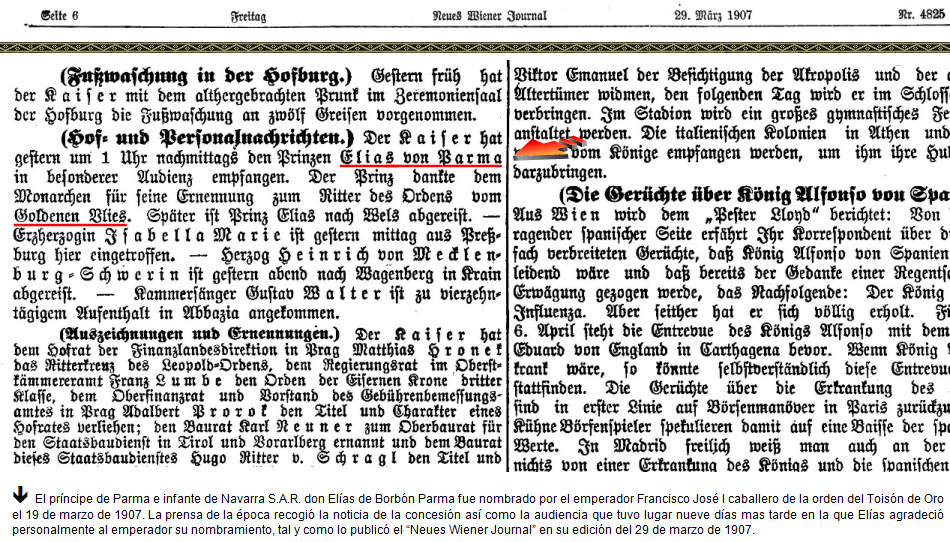 referenciar: Archives de actes de naissances de la commune de Biarritz - années 1875, 1880 et 1882 La Légitimité: journal historique hebdomadaire - 02/09/1883 Sport & Salon, Illustrierte Zeitschrift für die Vornehme Welt - 17/01/1903, 7/11/1903, 30/03/1907 Registro Civil de Palacio - Madrid, sección 4ª, tomo I, folio 1 - 07/02/1901 Tony-Henri-Auguste Reiset, vicomte de Reiset - “Les enfants du duc de Berry : d'après de nouveaux documents,...” - 1905 Almanach de Gotha. Annuaire généalogique, diplomatique et Statistique - 1910 (147e année) Wiener Zeitung - 01/10/1912 Österreichs illustrierte Zeitung - 06/10/1912 Mundo gráfico - Año IV. Núm 128, 08/04/1914 / Año XX. Núm 961, 02/04/1930 Jean de Bonnefon - “Almanach de Bruxelles” - 1918 Das interessante Blatt - 25/05/1922 Wiener Salonblatt - 15/02/1931, 26/03/1933, 09/02/1936, 19/04/1936, 03/05/1936, 27/06/1937 Wiener Sonn- und Montags-Zeitung - 02/03/1936 Neues Wiener Tagblatt - 31/05/1939 Baron Hervé Pinoteau - “Panorama de l'héraldique capétienne contemporaine” - 1955 Andrea Corsini - “I Bonaparte a Firenze” - 1961 Domingos de Araujo Affonso, Hubert Cuny, Simon Konarski, Alberto de Mestas et Baron Hervé Pinoteau - “Le sang de Lous XIV” - 1961 Ruolo del S.M.O. Constantiniano di S. Giorgio - “Nomine e promozioni del S.M.O. Constantiniano di San Giorgio, fatte da S.A.R. il Principe Don Alfonso, Duca di Calabria, Conte di Caserta ed Infante di Spagna, attuale Gran Maestro” - 23/01/1963 Ana de Sagrera - “La duquesa de Madrid (última reina de los carlistas)” - 1969 Juan Balansó - reportaje “En la muerte del Jefe de la Casa de Parma” ABC - 27/11/1974 Baron Hervé Pinoteau - “Nouveau panorama de l'Héraldique capétienne contemporaine et quelques lignes sur des questions connexes” - 1976 Juan Balansó - “La Familia Real y la familia irreal” - 1992 Cercle d'Études des dynasties royales européennes - “Le Royaume d'Espagne, Le Duché de Parme” - 1997 Monique Rousseau - “La famille ducale de Bourbon-Parme à Biarritz” Ekaina nº71 - 3ème Timestre 1999 Sébastien Ray - “La Succession Théorique des Rois de Navarre” - 2003 P.Conforti, M.B.Crispo, A.Grassi - “El Patrimonio heráldico de la Casa de Borbón-Parma” - 2004 52.15 Senescalía de la Casa Real Navarra - “Emblemas heráldicos de la Casa Real Navarra” - 2005 Gianfranco Rocculi - “Araldica della Real Casa Borbone Parma. Lo stemma del Ducato di Parma, Piacenza e Stati annessi” - 2008 Dynastie Capétienne : site sur la généalogie de la Dynastie Capétienne - dynastie.capetienne.free.fr - 2008 Olivier Coutau-Bégarie - “Boutons de livrée royale” - 14/12/2010 Christine Maisel-Schulz - “Kinderlandverschickungen österreichischer Kinder nach Spanien in den Mangeljahren nach dem Zweiten Weltkrieg” - 2010 Obm. Alois Prenner - “Kameradschaftsbund - Friedberg. Gründungsjahr 1911” - 2011 Piccola Casa della Divina Provvidenza - “Carta dei Servizi della Casa "Cottolengo" di Firenze” cottolengo.org - 24/06/2013 Luis Manuel de Villena Cabeza - “Genealogía Manuel de Villena” Geneanet.org - 2013 Rodrigo Moreno (@romo_b2s) - “Glashütte” instagram.com - 25/06/2017 Franz Stern - “Jagdgut Glashütte” anblick.at - mayo 2017 |