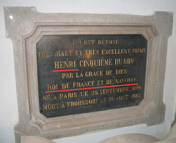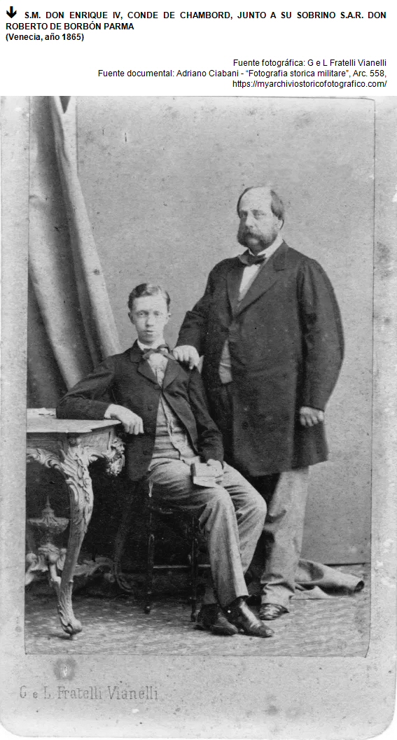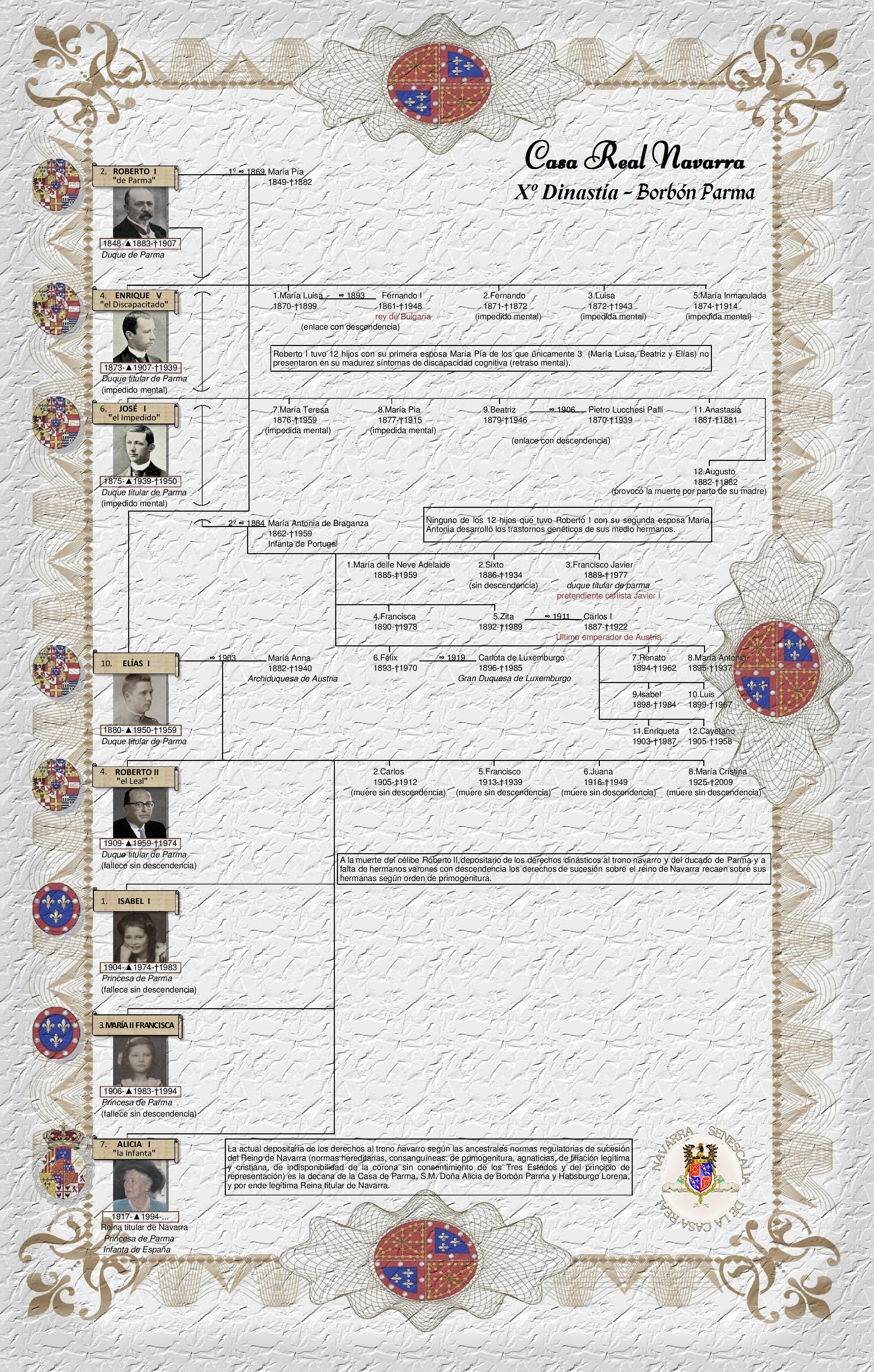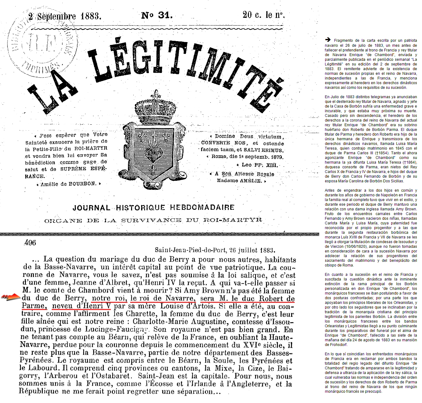 "(...) S.M. don Enrique IV, conde de Chambord y titular del trono navarro, murió en el exilio en 1883 en el castillo de Frohsdorf sin haber tenido hijos y transmitiendo sus derechos al trono del Reino de Navarra, sin conocimiento por parte de los actores, a la descendencia de su difunta hermana Luisa de Borbón (1819-1864) fallecida 19 años antes, concretamente a su hijo varón primogénito don Roberto I de Parma, quien ya ostentaba la titularidad del ducado de Parma y en quien recayó también desde ese momento la legitimidad del trono navarro. (...)"