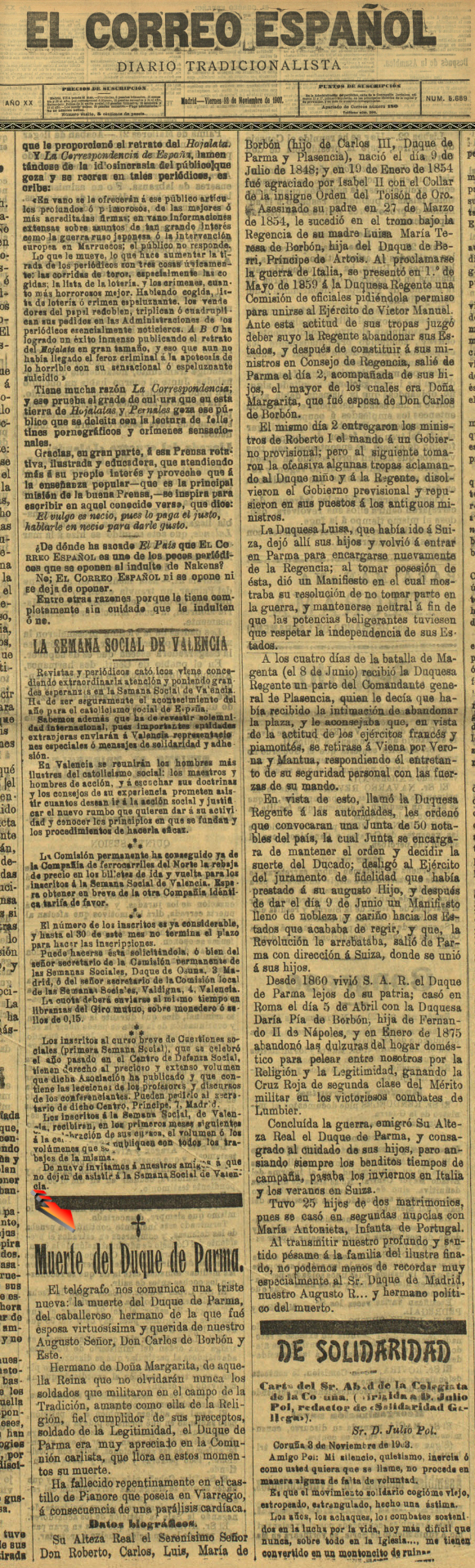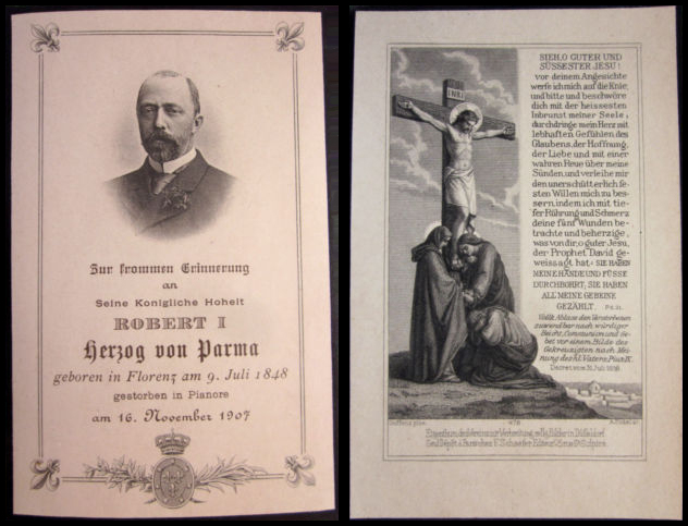 El 16 de noviembre de 1906, Roberto I de Borbón, último Duque reinante de Parma, "abanderado al servicio de la Iglesia católica" y transmisor de los derechos legítimos al trono de Navarra, moría de un ataque de parálisis cardiaca en la villa que mandó construir en Le Pianore, a los 59 años. La villa es conocida hasta el día de hoy como "Villa Borbone", en Le Pianore de Camaiore. Cercana está la Tenuta Reale de Viareggio, propiedad de la hermana del fallecido duque Roberto I, Margarita, esposa del pretendiente carlista Carlos VII, en cuya capilla yacen sus restos. Esa invalidez no tuvo efecto en la intitulación porque Elias de Borbón, el hijo sano y el más joven de su primer matrimonio respetó el testamento de su padre y se hizo tutor de sus hermanos impedidos, cargando sólo formalmente en funciones de los títulos nobiliarios del duque de Parma. Aunque mentalmente impedidos, sus hermanos mayores Enrique y José, su padre dejó claro en su testamento que como católico creía en la sanación de sus hijos incapacitados. (...)" |