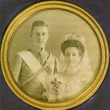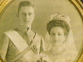 Fotografía de la boda del tercer hijo varón de S.M. don Roberto I, don S.A.R. Elías de Borbón Parma y su nuera S.A.I.R. doña María Ana de Austria. La pareja contrajo matrimonio el 25 de mayo de 1903" en la parroquia del Palacio Imperial de Hofburg de Viena. Él contaba con 23 años y ella 21. El matrimonio tuvo un total de 8 alumbramientos. |