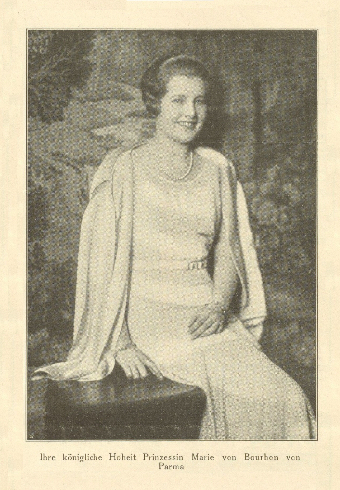 Fotografía de estudio de S.M. doña María Francisca de Borbón Parma con 24 años, segunda hija del matrimonio entre don Elías de Borbón Parma y María Ana de Habsburgo, nieta de S.M. don Roberto I. María nació el 5 de septiembre de 1906 en el castillo de Weilburg en Baden (Imperio austrohúngaro). Fotografía publicada el 15 de febrero de 1931 en la exclusiva revista de sociedad "Wiener Salonblatt". |