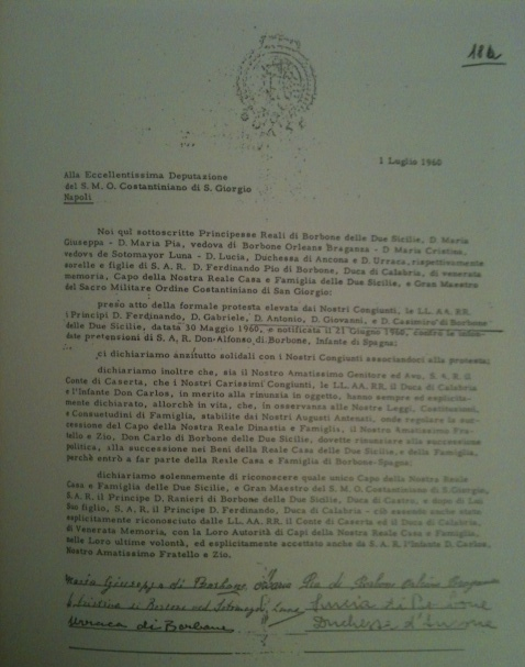 [ Pero el por entonces ya octogenario duque de Calabria y Jefe de la Casa de las Dos Sicilias no aceptó la propuesta de don Alfonso, y puso en alerta a su hermano don Raniero, inmediato y legítimo heredero de la Casa Real de Borbón Dos Sicilias, de las intenciones de don Juan y las ambiciones de don Alfonso. Hacia 1958 49.13 el conde de Barcelona, bajo su condición de Jefe de la Casa Real española, también sugirió directamente al duque de Calabria que nombrase al infante don Alfonso heredero en la Gran Maestría de las órdenes napolitanas, pero la ingerencia de don Juan tampoco consiguió alterar el firme criterio del Jefe de la Casa Real de las Dos Sicilias. El conde de Barcelona, igualmente, hizo saber al esperanzado infante don Alfonso de Borbón y Borbón la nula voluntad de don Fernando Pío en lo relativo a nombrarlo como su sucesor. Finalmente, el Jefe de la Casa Real de las Dos Sicilias don Fernando Pío falleció el 7 de enero de 1960 sin dejar descendencia masculina, por lo que por aplicación de las leyes que rigen la sucesión del Reino de las Dos Sicilias las dignidades y títulos de ese reino quedaron vacantes a la espera de ser reconocidos como propios por el inmediato y legítimo varón depositario, Raniero, hermano menor del finado, que sin embargo no disponía entre sus prebendas y títulos la dignidad de "infante de España". Pero a Raniero le surgió un competidor en la persona de su contestatario sobrino, el infante de España don Alfonso de Borbón y Borbón, marido de Alicia. El infante Alfonso, cuñado de don Roberto, espoleado por su condición de varón primogénito de la familia y arengado por su también cuñado el conde de Barcelona don Juan y cegado ante la posibilidad de recobrar un protagonismo que la historia le negaba, manifestó públicamente en enero de 1960 que la renuncia firmada en 1900 por su difunto padre Carlos Tancredo a los derechos del inexistente trono de las Dos Sicilias para él y sus descendientes no era válida.