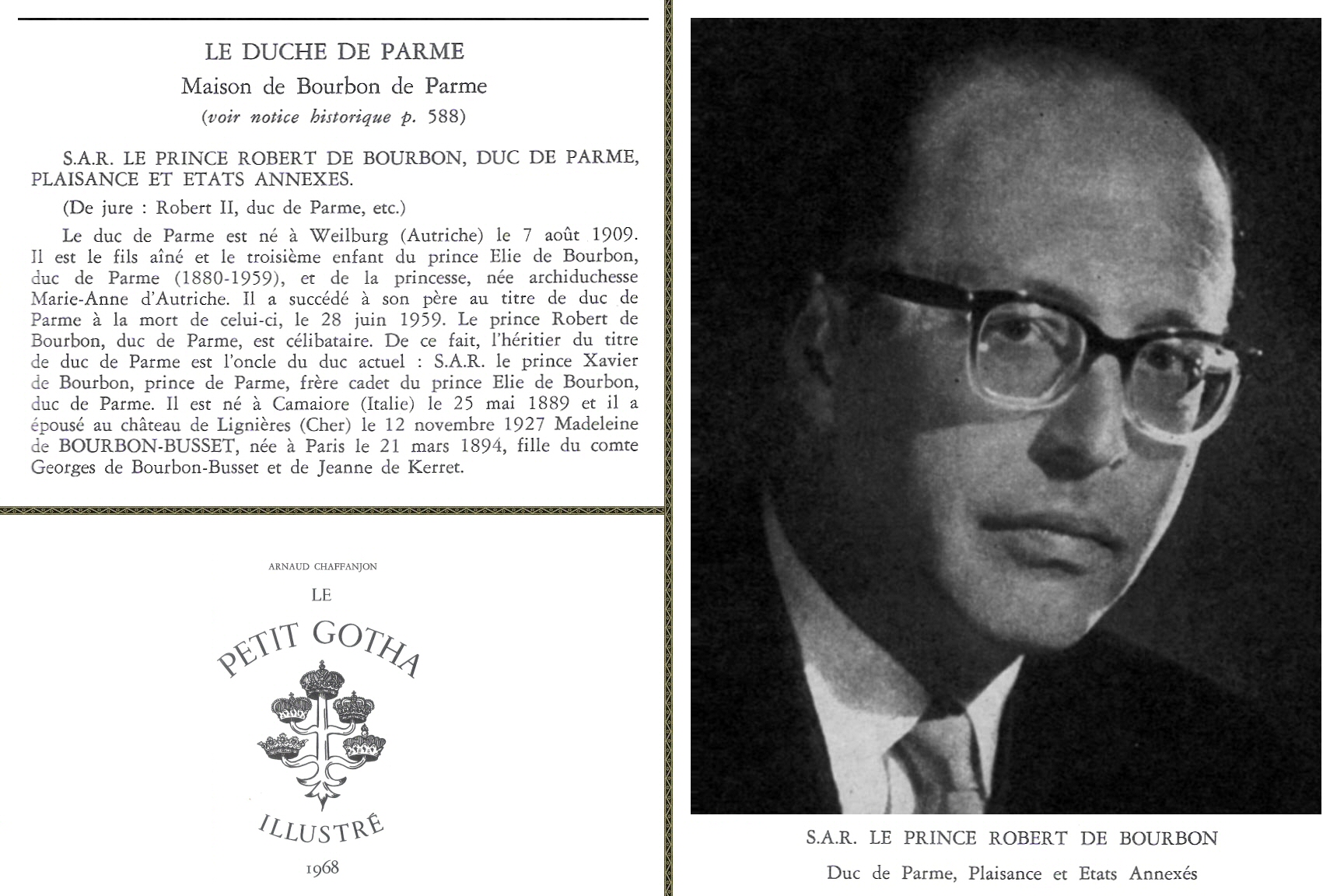 Metternichgasse nº7 [ Mientras tanto, los movimientos por el trono vacante del Reino de España continuaban. La maraña de influencias y vetos urdidos por don Juan de Borbón conde de Barcelona en contra de las pretensiones al trono de España del carlista Javier I desde que este último contrajera matrimonio morganático o desigual no desalienta a los irredentos carlistas, quienes no reculan en sus pretensiones y buscan maneras de redimir su situación. En 1960, fallecido su medio hermano don Elías de Borbón Parma un año antes, Javier I invita a su sobrino Roberto II a presidir como jefe de la familia ducal de Parma la boda de su primogénita S.E. doña María Francisca con el príncipe checo Eduardo de Lobkowicz en París. La invitación tenía un significado más profundo; a efectos del difunto Elías I, jefe de los Borbón Parma y seguidor de las directrices del conde de Barcelona, el matrimonio que contrajo su medio hermano y pretendiente carlista Javier I de Borbon Parma hacía mas de 30 años con Magdalena Borbón-Busset era morganático o desigual. Aunque aquel enlace celebrado en Lignières el 12 de noviembre de 1927 contó con el beneplácito de don Jaime I y también con la posterior venia de su sucesor don Alfonso Carlos, Jefes de la Casa de Borbón a la vez que pretendientes carlistas, la pulcra conciencia de Javier I requería tanto del permiso del jefe de los Borbón Parma, como del tratamiento de "Alteza Real" por parte de su sobrino hacia su esposa doña Magdalena para reactivar los derechos de sucesión al ducado parmesano en el caso de que su sobrino Roberto "el Leal" falleciera sin descendencia masculina.